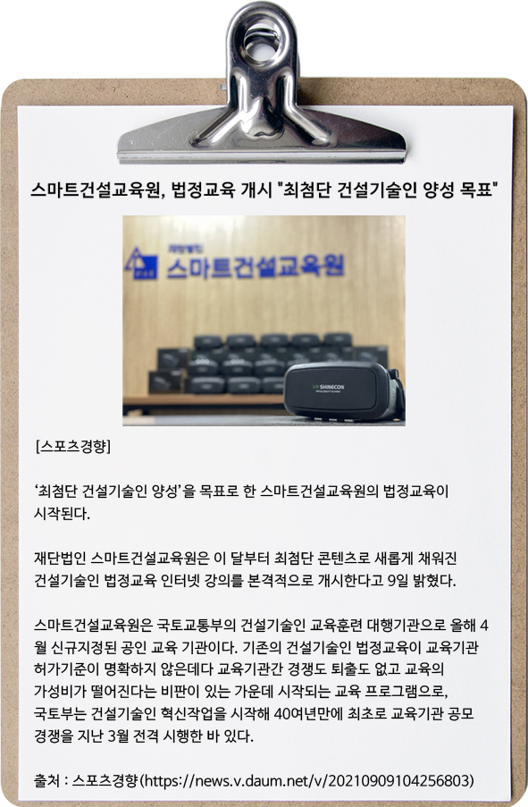 우리 스마트건설교육원이 드디어 언론에서 제대로 각광을 받기 시작했습니다.